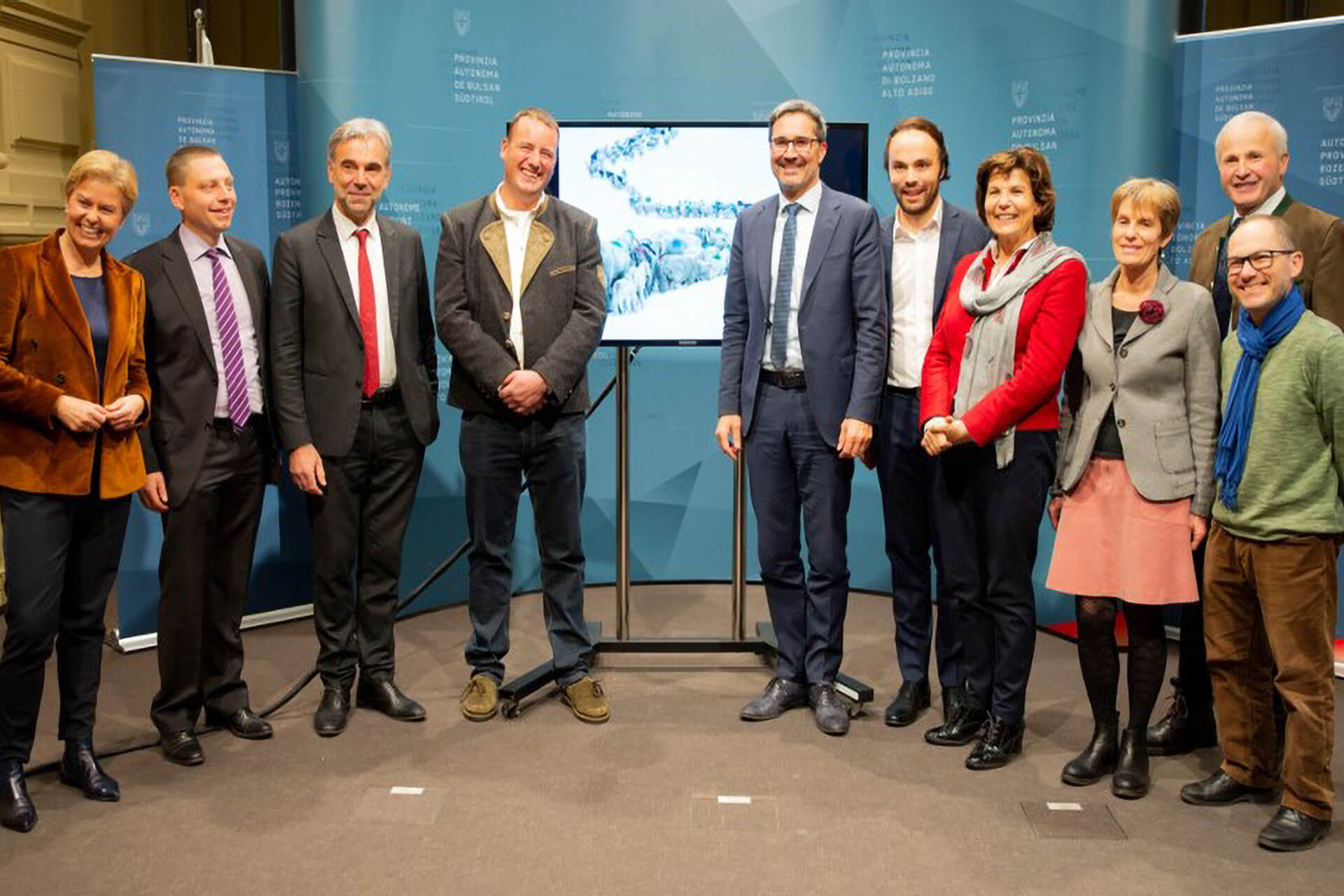 From left to right: Monika Gamper & Benjamin Santer, Schnals cultural association; Arnold Schuler, South Tyrolean regional councillor for agriculture, forestry, civil protection and communities; Martin Rainer, agricultural community; Arno Kompatscher, Governor of South Tyrol; Philipp Achammer, South Tyrolean regional councillor for German education and culture and for integration; Maria Hochgruber Kuenzer, South Tyrolean regional councillor for spatial development, landscape and monument preservation; Luise Gafriller, Pro Vita Alpina cultural association; Josef Götsch, agricultural community; Johannes Ortner, Pro Vita Alpina cultural association.