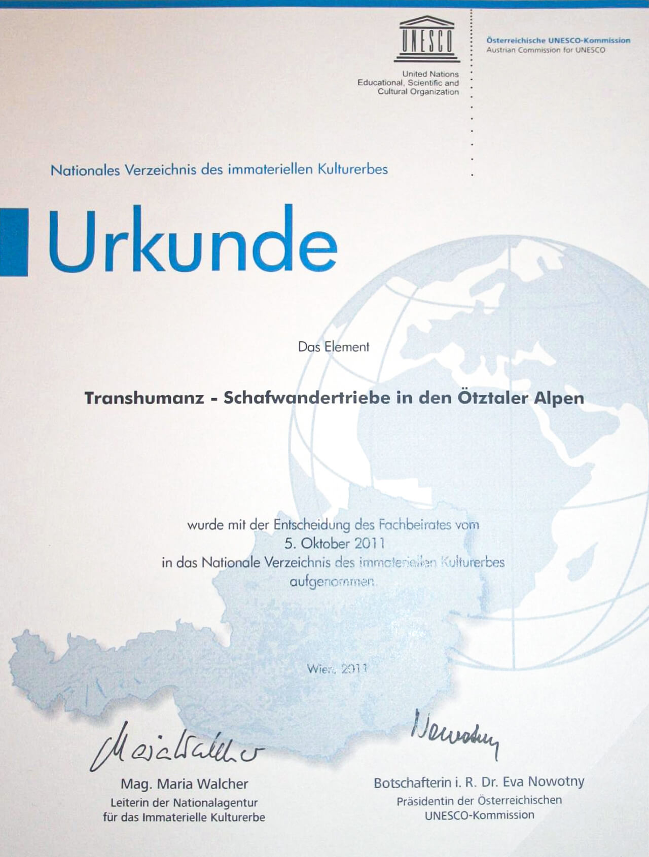 On the one hand, there is a National Inventory in which examples of a country’s intangible cultural heritage are included. Analogous to the World Heritage, which is reserved for material heritage, there is also a Representative List of the Intangible Cultural Heritage of Humanity. Transhumance in the Ötztal Alps has been included in both lists.